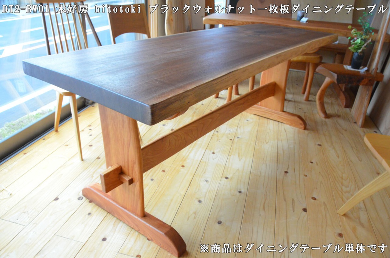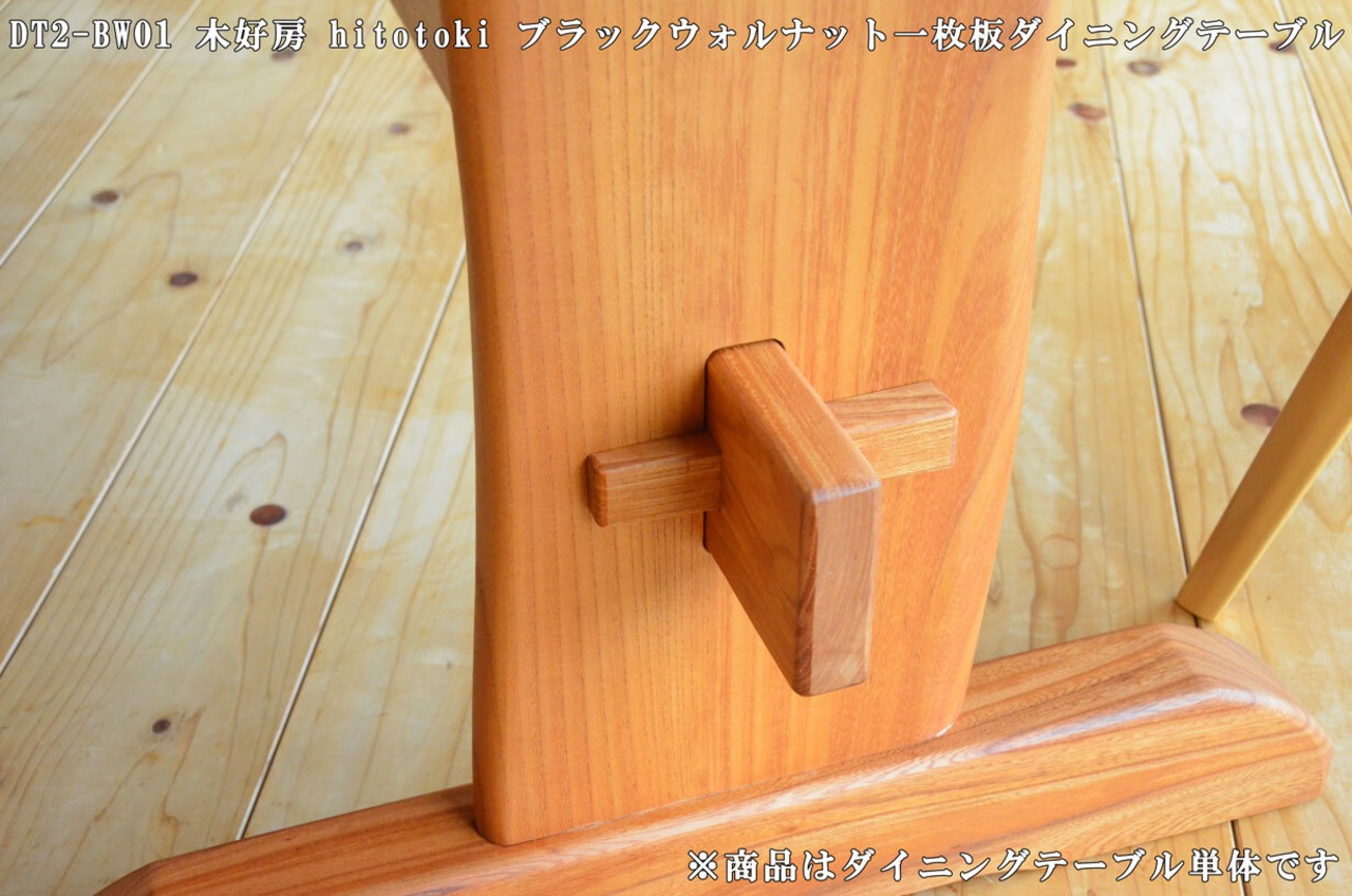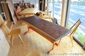 色調は深みのあるブラックウォルナットの自然な色合いで、天板奥行は60~70㎝スリムタイプ4〜6人掛け推奨です。脚は国産ケヤキの無垢板で木目が美しいものを選んで製作。分解可能かつ丈夫な構造です。